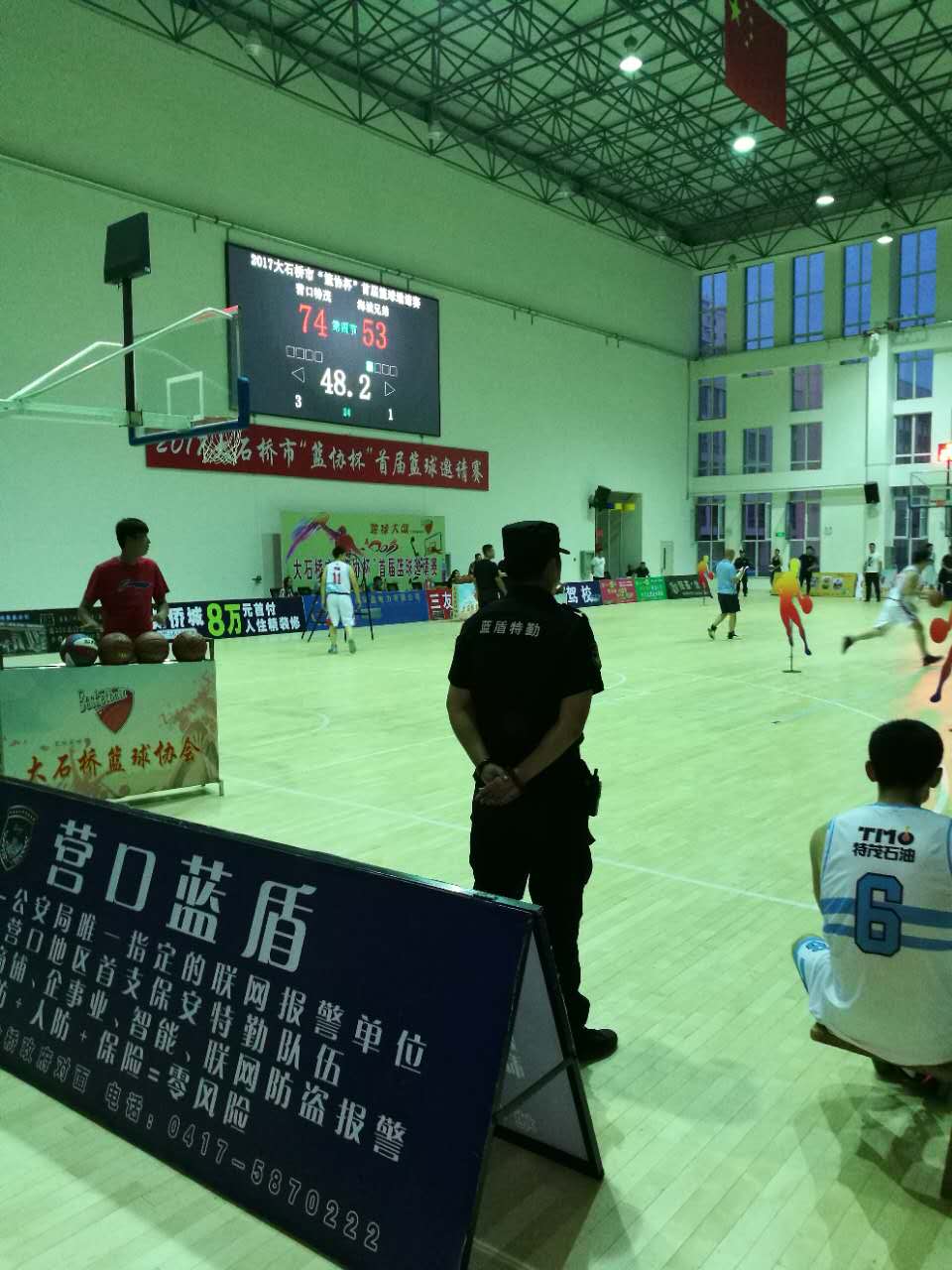 2017年5月26日到6月3日,大石桥市“篮协杯”首届篮球邀请赛在市第二初级中学体育馆举行,现场场面激烈,吸引了众多篮球爱好者前来观战。为了保障为期九天的篮球赛顺利有序的进行,营口蓝盾保安公司特勤大队每天派出8名特勤人员负责此次活动的安全保卫工作,确保此次篮球赛活动的安全,疏导、指引体育馆内的观战人员。参与此次篮球赛活动的特勤人员精神饱满、统一动作、服装和行动,保证了此次篮球赛圆满的落下帷幕。特勤大队人员为我公司树立了良好的形象,客户给予了高度好评及肯定!