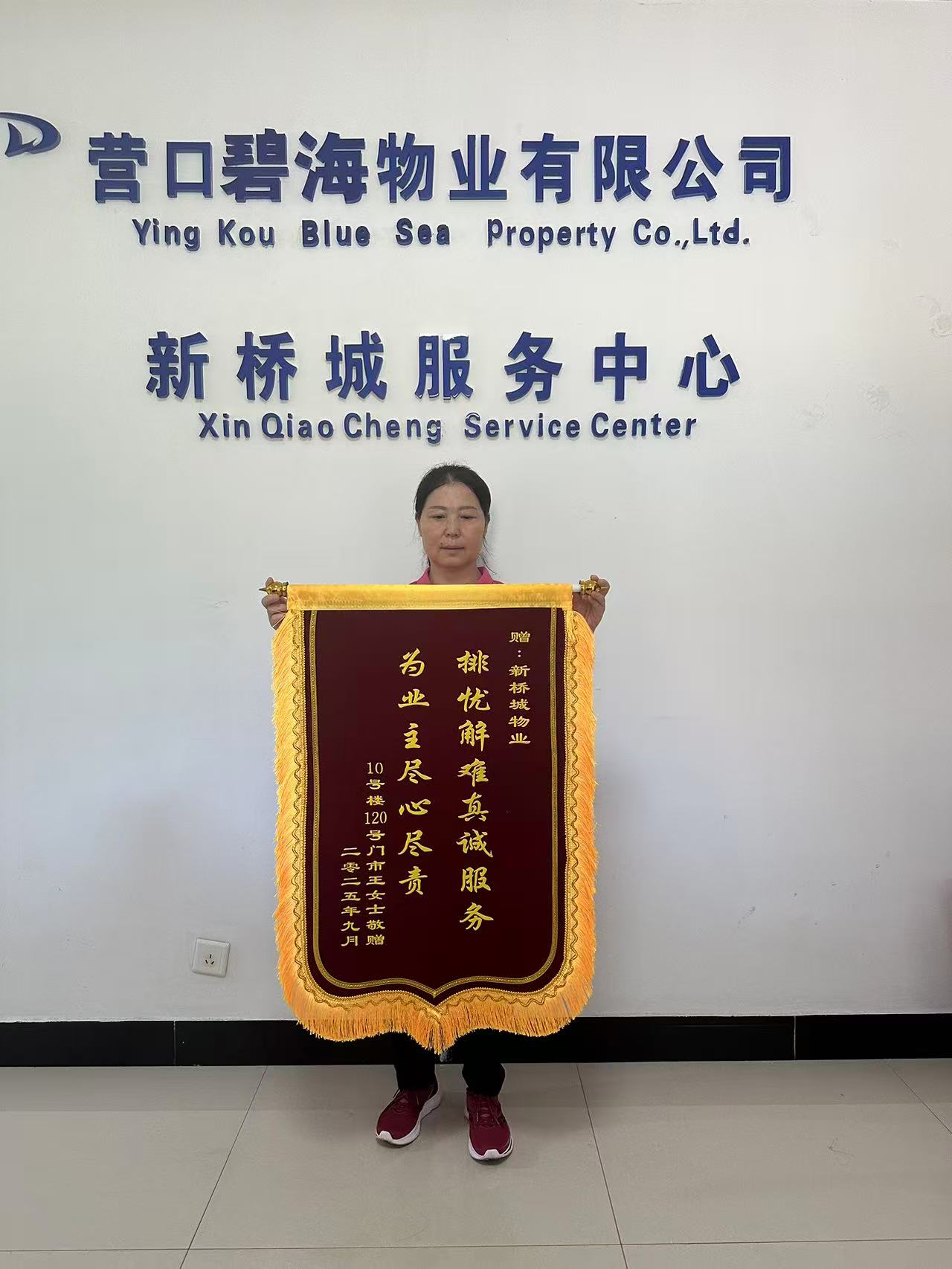 2025年8月26号,新桥城小区10号楼12号门市业主王女士发现自家的马桶没有办法正常使用,临时出现这种情况王女士也不知道该怎么办,短时间内又找不到人帮忙处理维修。这时候王女士突然想到了,尝试拨打物业电话,看看物业能不能帮忙看看。在接到王女士的求助电话后,物业负责人马上派了新桥城工程维修师傅王红庆到业主家帮忙查看。王师傅拿着工具箱到业主家后,进行了一番细致的检查,最后发现是马桶水箱漏水了。找到问题所在,很快王师傅就将马桶漏水问题处理好了。当时业主王女士连连称赞感谢,说多亏了王师傅,要不自己真不知道该怎么办。2025年8月29日,王女士将一面锦旗送到了蓝盾物业办公室,以表感谢!